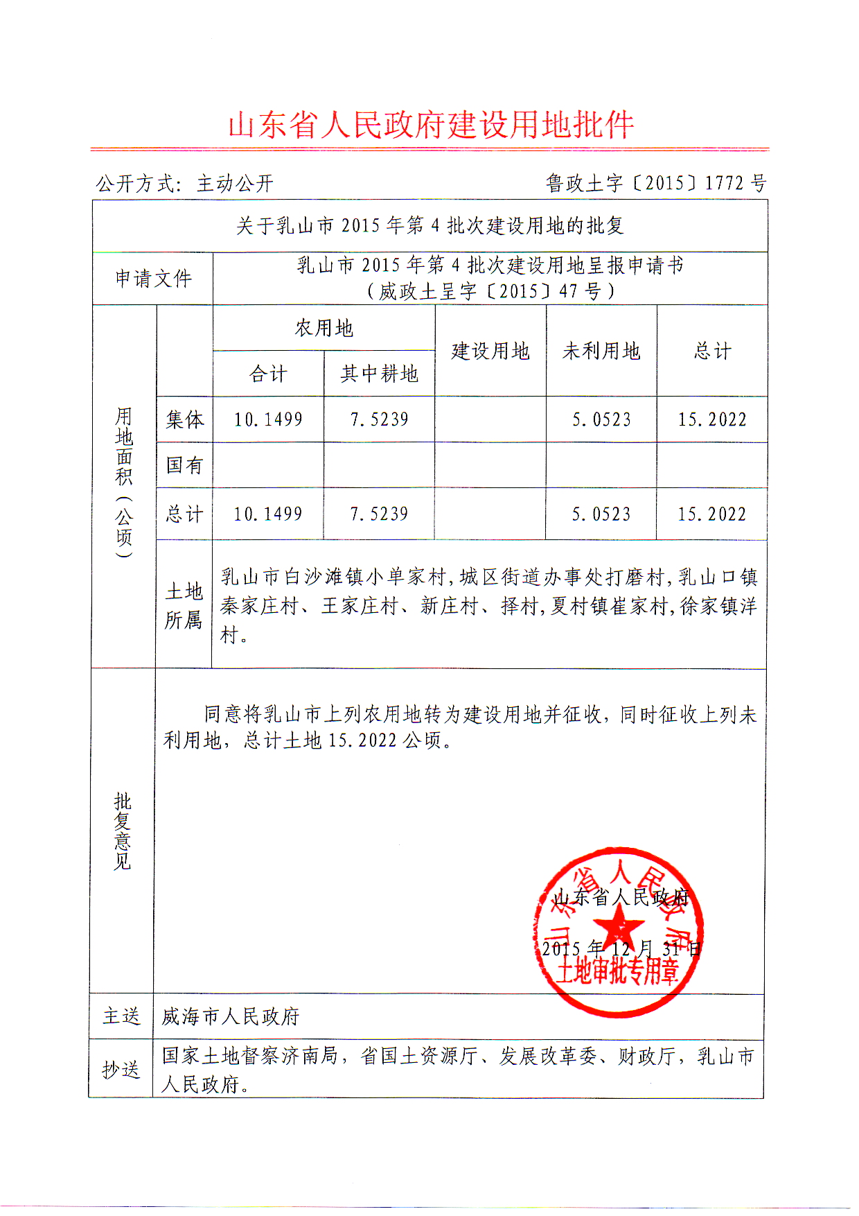 山东外事职业大学教学配套设施建设项目涉及到的2015年第4批次的建设用地批复