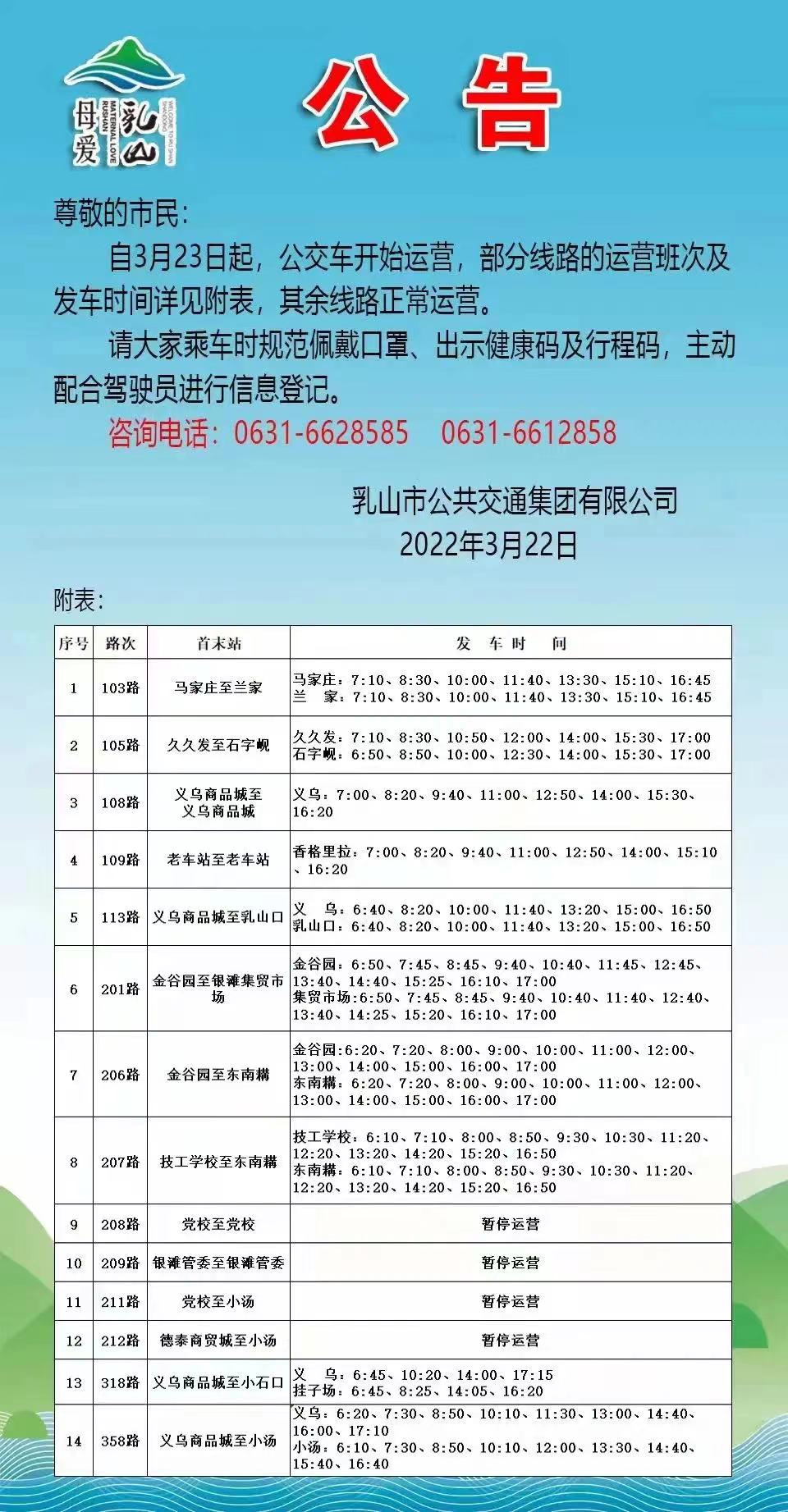 3月23日起,乳山市公交车开始运营,部分线路的运营班次及发车时间详见附表,其余线路正常运营。