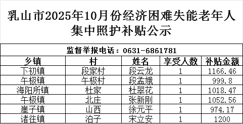 乳山市10月份经济困难失能老年人集中照护补贴公示