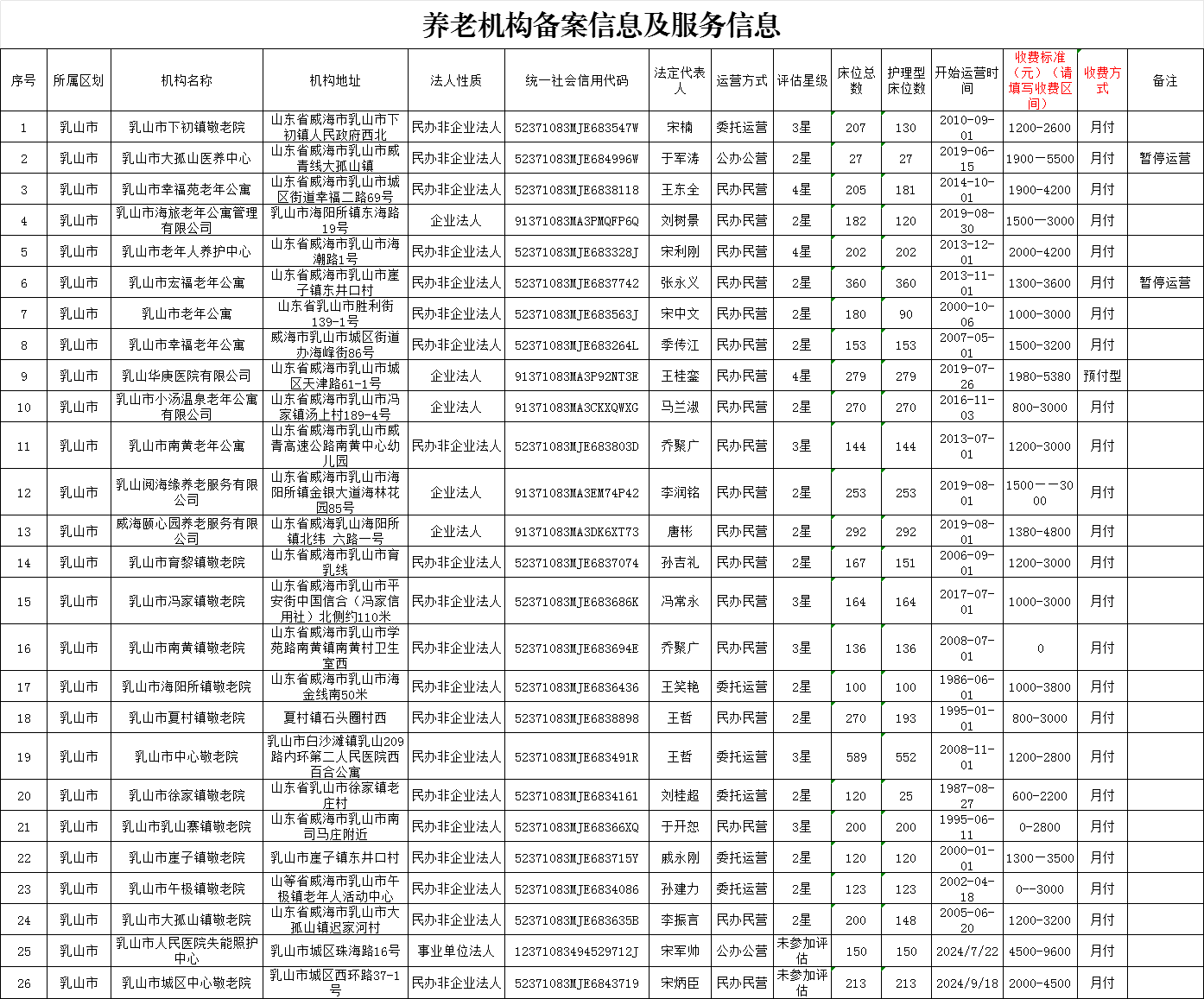 乳山市民政局2025年9月养老机构备案信息及服务信息