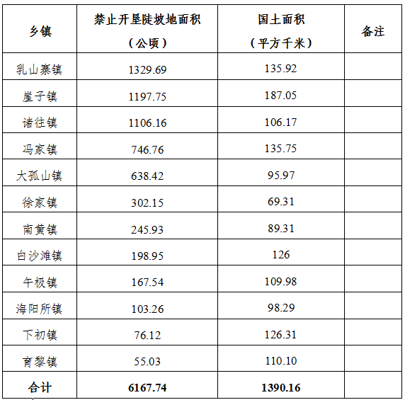 一、依据水利部《禁止开垦陡坡地范围划定技术指南》,乳山市禁止开垦陡坡地范围面积共6167.74公顷,涉及乳山寨镇、崖子镇、诸往镇、冯家镇、大孤山镇、徐家镇、南黄镇、白沙滩镇、午极镇、海阳所镇、下初镇、育黎镇12个镇。具体分布范围和面积见附件。