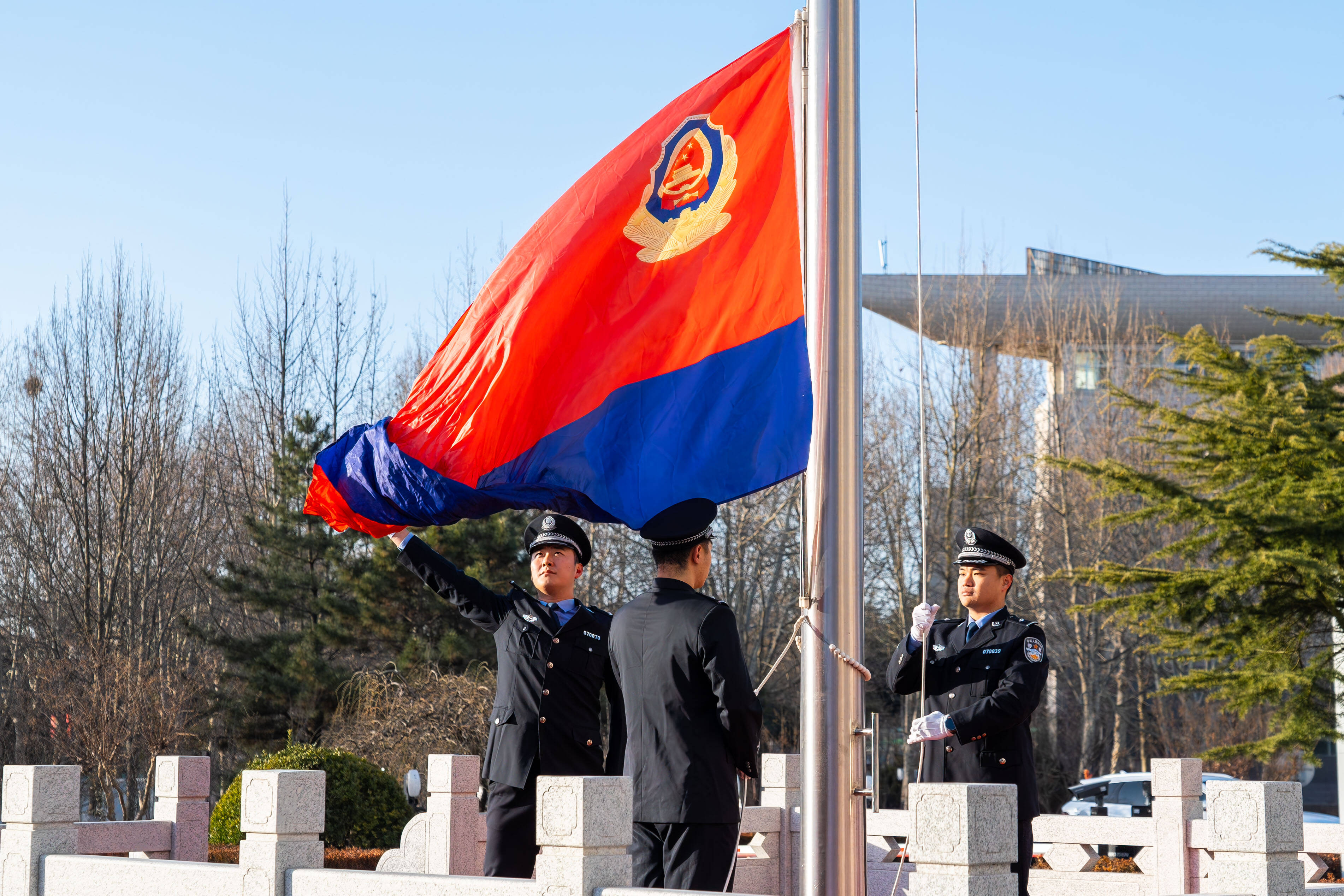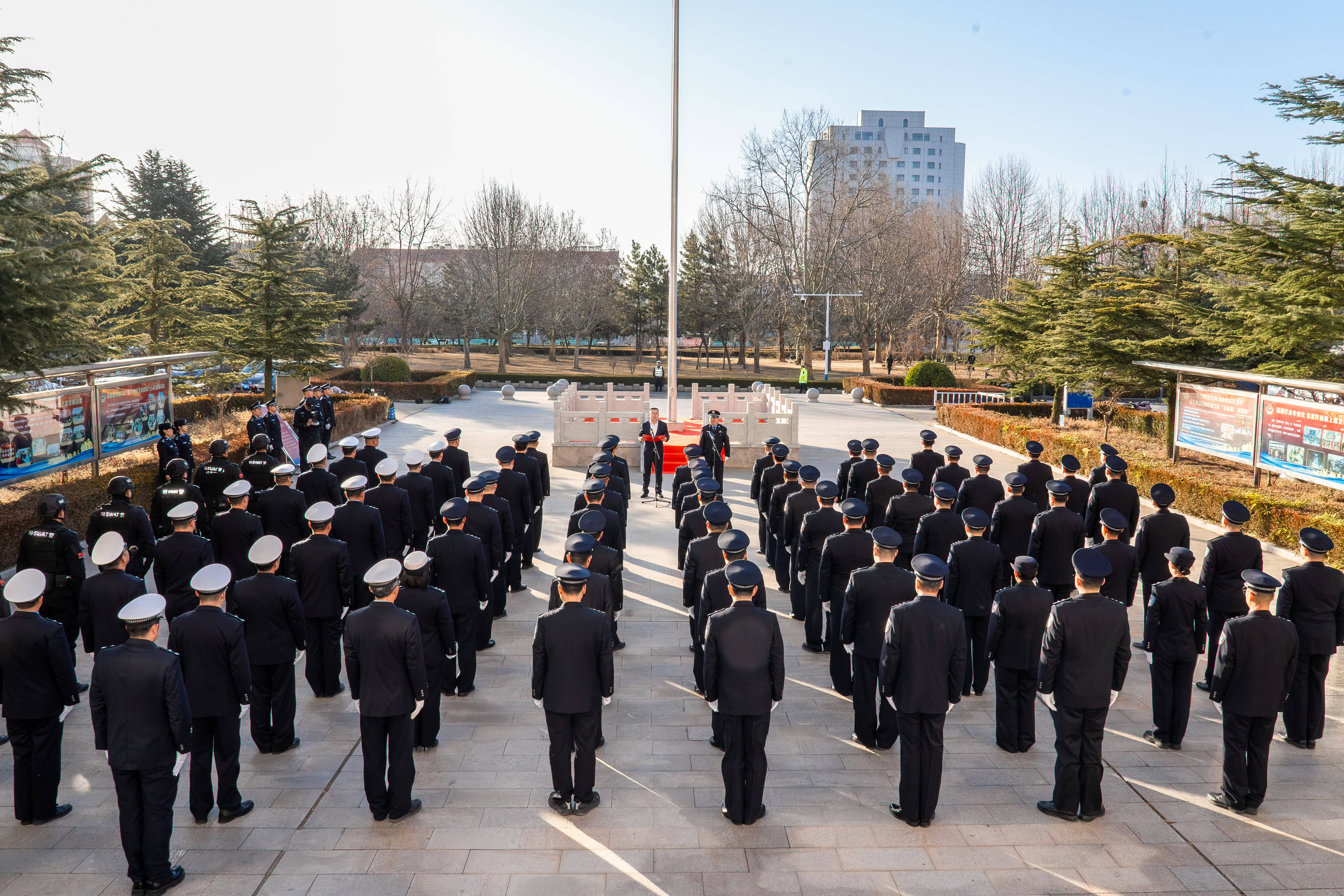上午8时30分,伴随着激昂雄壮的中国人民警察警歌,警旗徐徐升起,全体公安干警整装肃立,向警旗庄严敬礼。随后,全体干警面向警旗高举右拳,重温人民警察誓词,响亮而坚定的宣誓声在活动现场回荡,震撼人心。