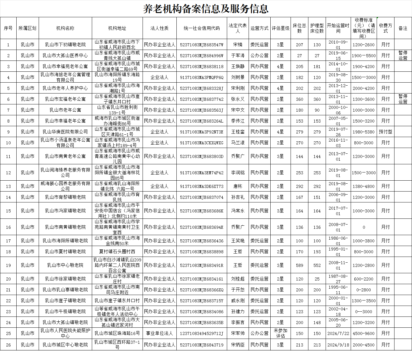 乳山市民政局2026年4月养老机构备案信息及服务信息