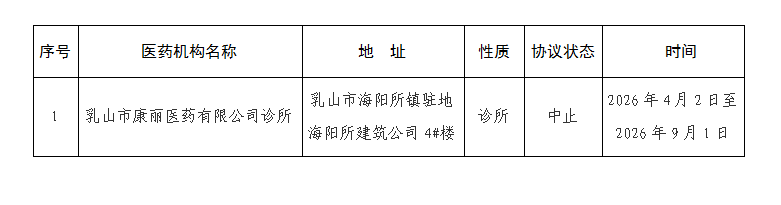 根据《医疗机构医疗保障定点管理暂行办法》(国家医疗保障局令第2号)及威海市医保服务协议等有关规定,经医药机构自主申请,我中心正式中止与乳山市康丽医药有限公司的医保协议关系,中止时间:2026年4月2日至2026年9月1日。